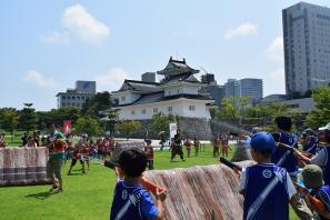 [3]城址公園では「まちなか戦国体験」が行われました。チャンバラ合戦や水鉄砲で撃ち合う水合戦では、参加者が戦国武将になりきり、大人も子どもも一緒になって熱戦を繰り広げました。また、今年は新たに、宝箱を探し出してクイズに挑戦する「戦国ウォークラリー」も開催されました。