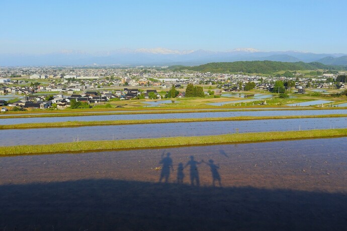 田んぼにかげがうつっておもしろかったです。雪がのこった山も見えて、まちもきれいで、とやまっていいなぁと思った時間でした。 -