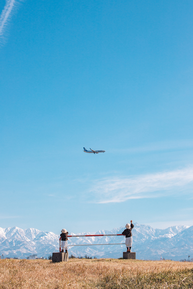 いつもの散歩中に見つけた僕らの特等席。飛行機がよく見えると喜ぶ子どもたち。立山のある生活が当たり前の子どもたちは贅沢だ。