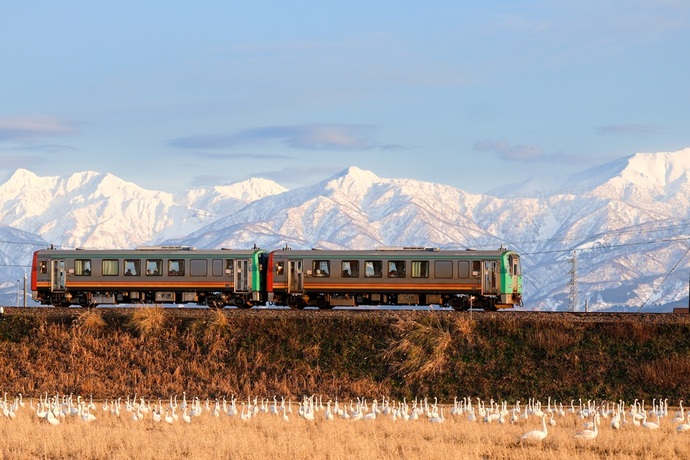 日中、餌をついばみに来ている白鳥の群れは、普通列車の通過のたびに、一斉に首を伸ばし、景色を堪能しています。 -